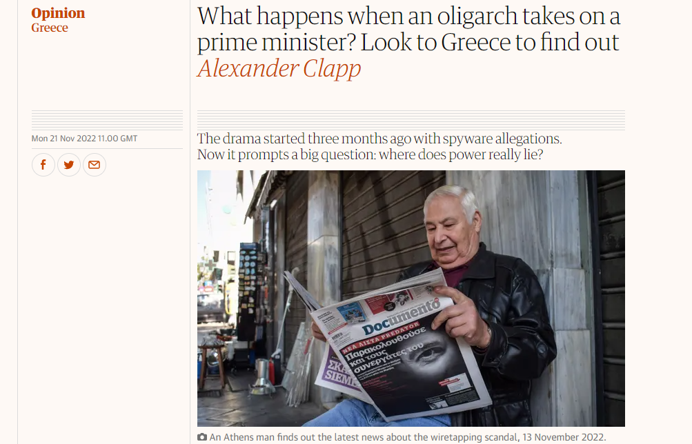 Άρθρο που τιτλοφορείται ως: «Τι συμβαίνει όταν ένας ολιγάρχης τα βάζει με έναν πρωθυπουργό. Ρίξτε μια ματιά στην Eλλάδα για να μάθετε» βρίσκεται στο πρωτοσέλιδο της σημερινής Guardian. Το άρθρο κάνει αναφορά στην κατάσταση της Ελλάδας μετά τις αποκαλύψεις των τελευταίων εβδομάδων για το σκάνδαλο των υποκλοπών.