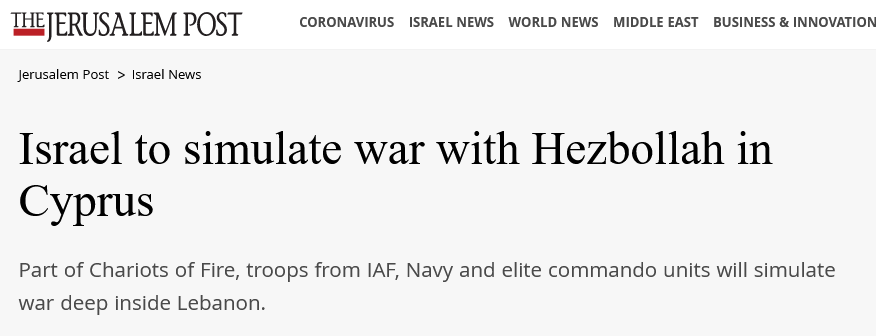 Στην άσκηση συμμετέχουν πλωτές, εναέριες και χερσαίες δυνάμεις της Εθνικής Φρουράς Κύπρου ενώ πριν λίγες μέρες η ισραηλινή αγγλόφωνη εφημερίδα Jerusalem Post διαλαλούσε πως ένα από τα «σενάρια» προβλέπει επίθεσης σε…στόχους της Χεζμπολάχ στο Λίβανο.