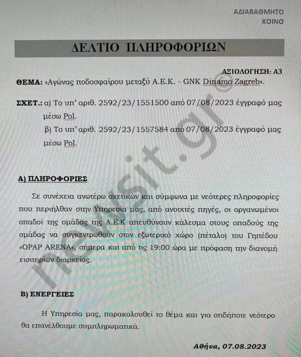 Την επόμενη μέρα και ειδικότερα στις 7 Αυγούστου 2023, σύμφωνα με δεύτερο Δελτίο Πληροφοριών με θέμα «Αξιολόγηση: Α3. Αγώνας ποδοσφαιρου μεταξυ ΑΕΚ – GΝΚ Dinamo Zagre», που αποκαλύπτει το ίδιο ρεπορτάζ καθώς και επισυναπτόμενα εγγραφα απο το συστημα POL. με αριθμούς το υπ’ 2592 / 23 / 155 1500 από 7/8/ 2023 και 2592 / 23 / 155 7584 από 7/8/ 2023, που εχει στη διάθεση του το NewsIT, αναφέρονται τα εξής: «Σε συνέχεια ανωτέρω σχετικών και σύμφωνα με νεότερες πληροφορίες που περιήλθαν στην υπηρεσία μας από ανοιχτές πηγές, οι οργανωμένοι οπαδοί της ομάδας της ΑΕΚ , απευθύνουν κάλεσμα στους οπαδούς της ομάδας να συγκεντρωθούν στον εξωτερικό χώρο — πέταλο – του γηπέδου OPAP ARENA σήμερα και από τις 19:00 ώρα με πρόφαση την διανομή εισιτηρίων διαρκείας».
