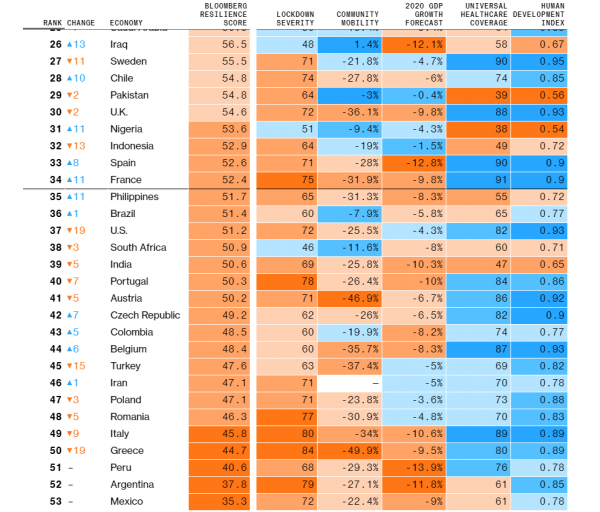 Δυστυχώς το Bloomberg δεν συμμερίζεται την “περηφάνια” του. Στην κατάταξη για τον βαθμό επιτυχίας των χωρών, στην αντιμετώπιση της πανδημίας, μας κατατάσσει τελευταίους στην Ευρώπη και συνολικά στην 50η θέση σε σύνολο 53 χωρών.