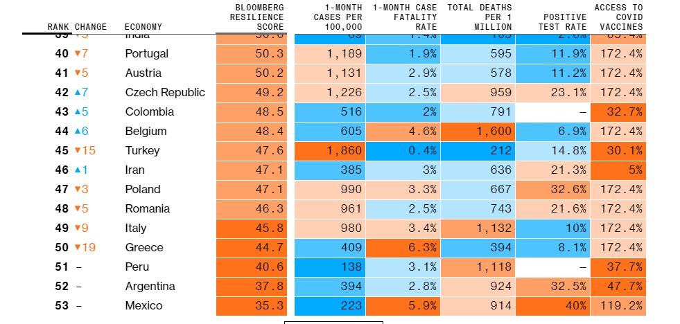 Συγκεκριμένα, το πρακτορείο Bloomberg ανανέωσε στις 20 Δεκεμβρίου την κατάταξή του, Covid Resilience Ranking, που περιλαμβάνει τις 53 χώρες του πλανήτη με οικονομία μεγαλύτερη των 200 δισ. δολαρίων. Στα νέα στοιχεία, η Ελλάδα σημειώνει βουτιά 19 θέσεων και κατατάσσεται πλέον στην 50η θέση σε σύνολο 53, τελευταία στις χώρες της Ε.Ε., μία κάτω από την Ιταλία και πάνω μόνο από το Περού, την Αργεντινή και το Μεξικό.