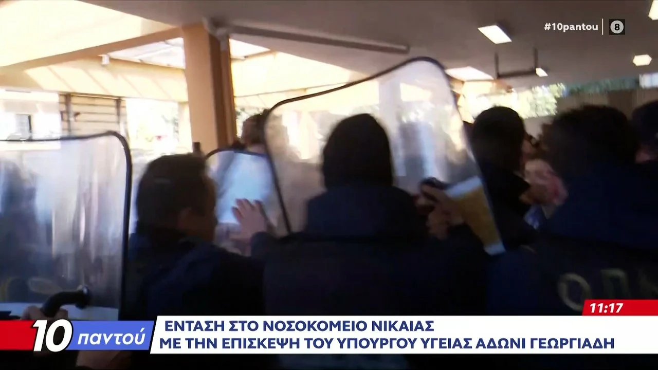 Tension broke out outside the General Hospital of Nikaia on Thursday as healthcare workers gathered to protest the visit of Health Minister Adonis Georgiadis, who had arrived for the inauguration of new emergency department facilities. The minister was surrounded by riot police, who cleared a path for his entry, prompting further anger from those present.