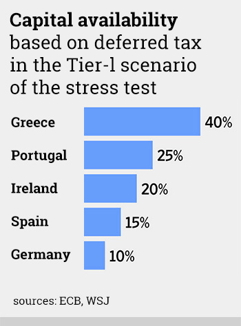 However, it’s worth examining the graphic (inset left): According to information made public by the European Central Bank, in the basic scenario of the stress tests, 40% of the capital of banks is covered by the deferred tax. Simply put, almost half the money that is supposedly found in our bank coffers is….zilch.
