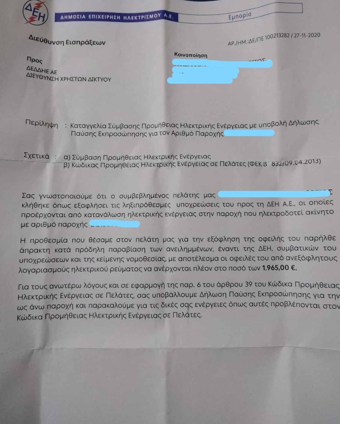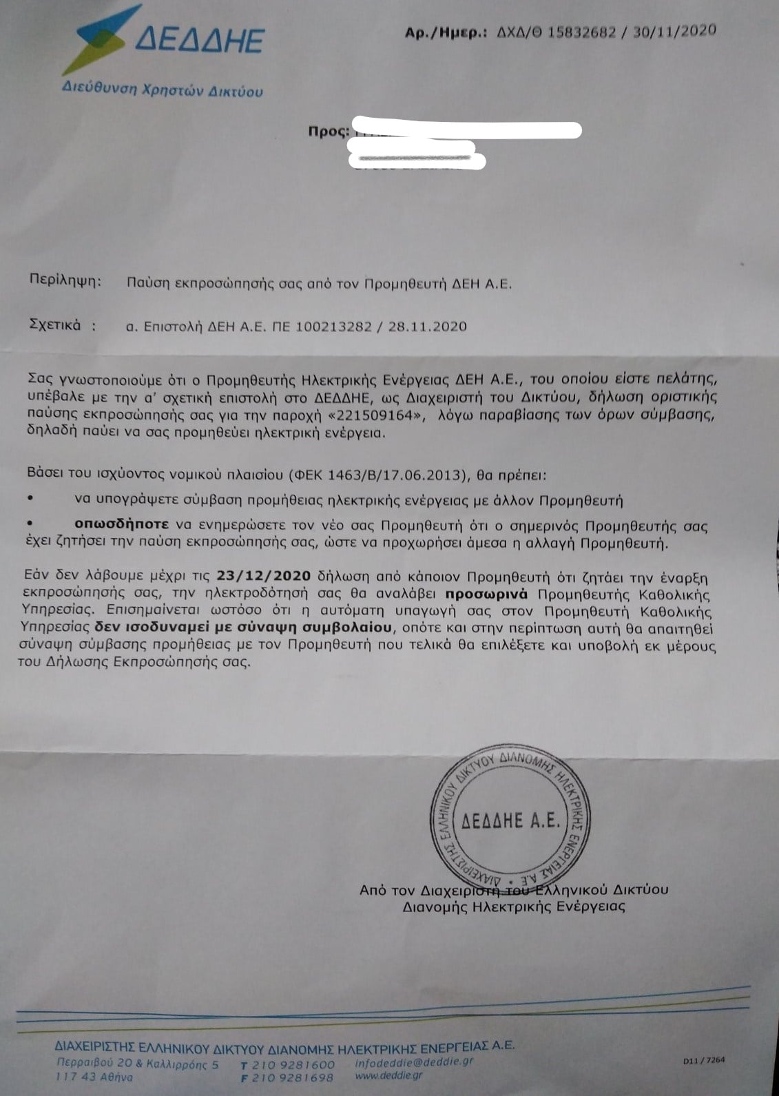 Αντί αυτού όμως στάλθηκε ΚΑΤΑΓΓΕΛΙΑ ΣΥΜΒΑΣΗΣ ΠΡΟΜΗΘΕΙΑΣ ΗΛΕΚΤΡΙΚΗΣ ΕΝΕΡΓΕΙΑΣ με ότι συνεπάγεται αυτό στην μέση του χειμώνα, γιατί πλέον εκτός της στέρησης του ρεύματος δεν θα έχει και θέρμανση, με αποτέλεσμα την περαιτέρω επιβάρυνση της υγείας του ιδίου και της συζύγου του που τον φροντίζει.