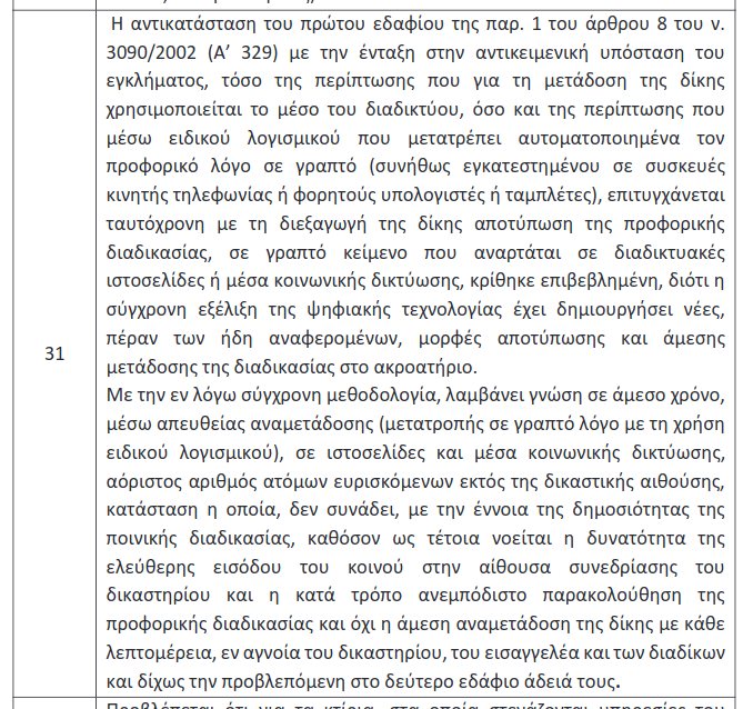 Το άρθρο 31 αναφέρει δε ότι «κατ’ εξαίρεση, το δικαστήριο μπορεί να επιτρέψει» τη μετάδοση όσων συμβαίνουν στην εκδίκαση υποθέσεων «εφόσον συναινούν ο εισαγγελέας και οι διάδικοι και συντρέχει ουσιώδες δημόσιο συμφέρον».