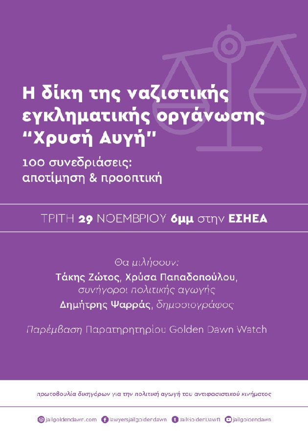 Θα μιλήσουν: ο Τάκης Ζώτος, δικηγόρος πολιτικής αγωγής για τους Αιγύπτιους αλιεργάτες, η Χρύσα Παπαδοπούλου, δικηγόρος πολιτικής αγωγής για την οικογένεια Φύσσα, και ο Δημήτρης Ψαρράς, δημοσιογράφος στην Εφημερίδα των Συντακτών. Θα παρέμβει εκπρόσωπος του Παρατηρητηρίου Golden Dawn Watch και θα ακολουθήσει συζήτηση και παρεμβάσεις.