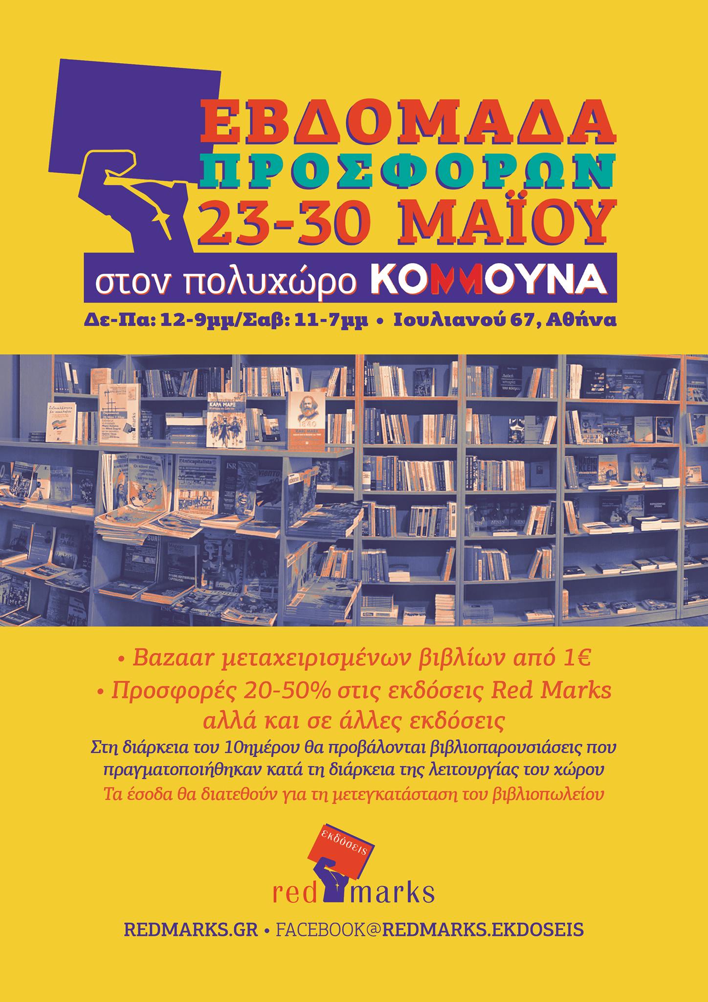 Με αυτό το μήνυμα καλούνται οι αναγνώστες και υποστηρικτές των ανεξάρτητων εκδόσεων στο bazaar μεταχειρισμένων βιβλίων από 1€, καθώς και προσφορές 20-50% στις εκδόσεις RedMarks αλλά και σε άλλες εκδόσεις που θα βρίσκεται σε εξέλιξη μέχρι και το Σάββατο 30 Μαΐου στο φιλόξενο κτίριο της «Κομμούνας» στην οδό Ιουλιανού, με στόχο της χρηματοδότηση της μετακόμισης των εκδόσεων σε νέο χώρο.
