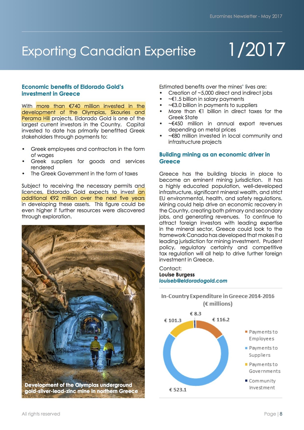 Η Eldorado επίσης ισχυρίζεται ότι «από την εξαγορά των Μεταλλείων Κασσάνδρας με αντίτιμο 2 δις δολάρια το 2012, η Eldorado έχει επενδύσει επιπλέον 1 δις δολάρια στη χώρα».