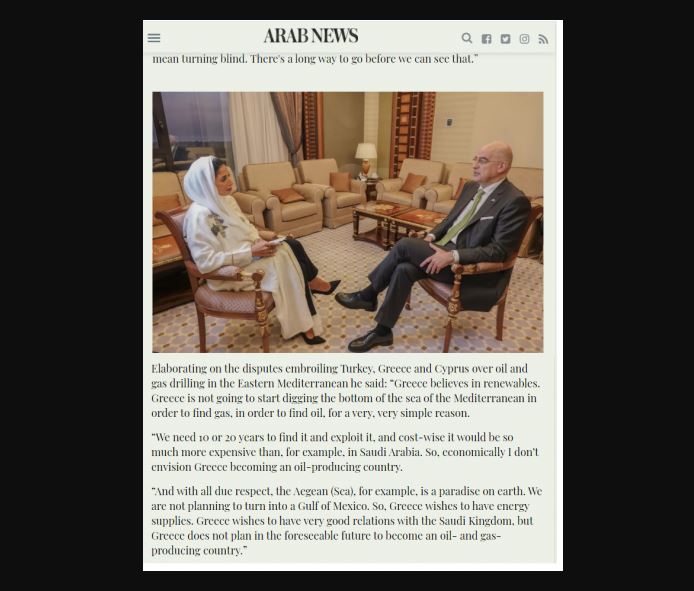 «Η Ελλάδα πιστεύει στις ανανεώσιμες πηγές ενέργειας και δεν πρόκειται να αρχίσει να σκάβει τον βυθό της Μεσογείου για να βρει αέριο και πετρέλαιο, για έναν πολύ απλό λόγο… Χρειαζόμαστε 10 με 20 χρόνια για να το βρούμε και να το εκμεταλλευτούμε, και από οικονομική άποψη θα ήταν πολύ πιο ακριβό για παράδειγμα από το δικό σας, της Σαουδικής Αραβίας. Έτσι, οικονομικά δεν οραματίζομαι την Ελλάδα να γίνει χώρα παραγωγής πετρελαίου».
