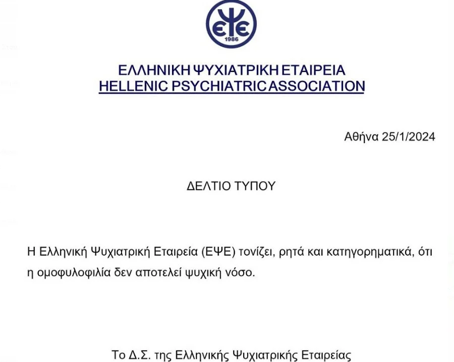 Στον απόηχο των παραπάνω, η Ελληνική Ψυχιατρική Εταιρεία ανάρτησε ένα λιτό αλλά ξεκάθαρο μήνυμα στα μέσα κοινωνικής δικτύωσης, ότι «ρητά και κατηγορηματικά, ότι η ομοφυλοφιλία δεν αποτελεί ψυχική νόσο».