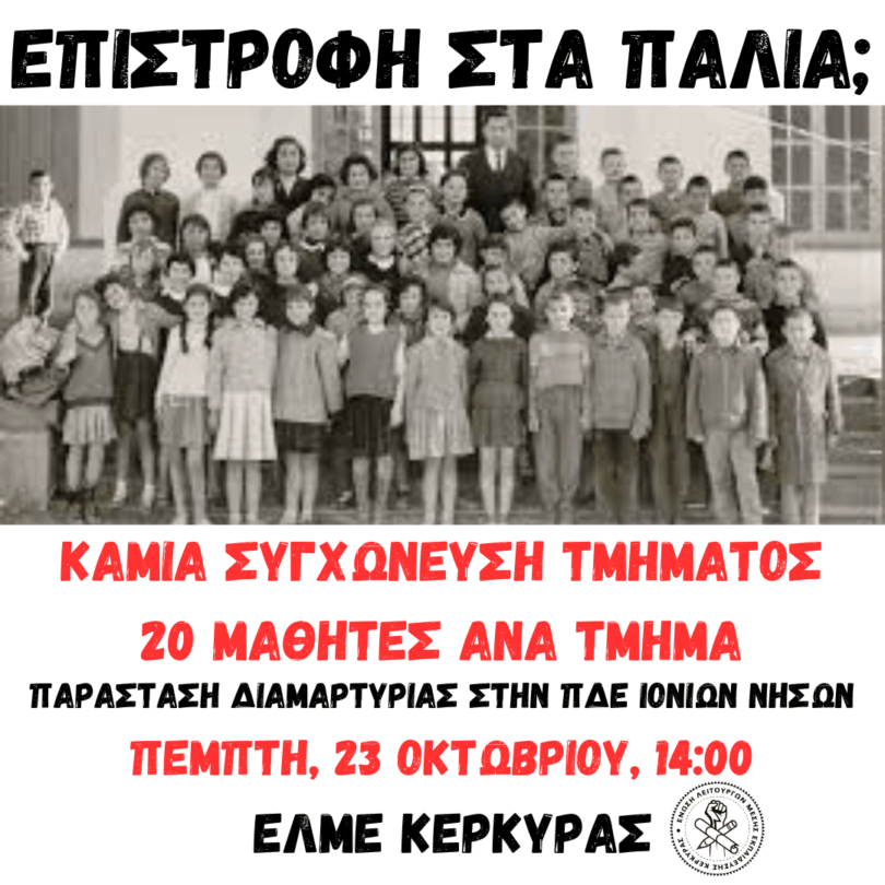 Το Δ.Σ. της ΕΛΜΕ Κέρκυρας, καλεί όλους τους γονείς, να μη δεχτούν να πάρουν τα παιδιά τους από το σχολείο και να διεκδικήσουν μαζί μας αύριο στην ΠΔΕ Ιονίων Νήσων το αυτονόητο και παιδαγωγικά ορθό, δηλαδή το μη κλείσιμο των τμημάτων και την παραμονή των μαθητών στα σχολεία τους, δίπλα στους φίλους τους και στους συμμαθητές τους.
