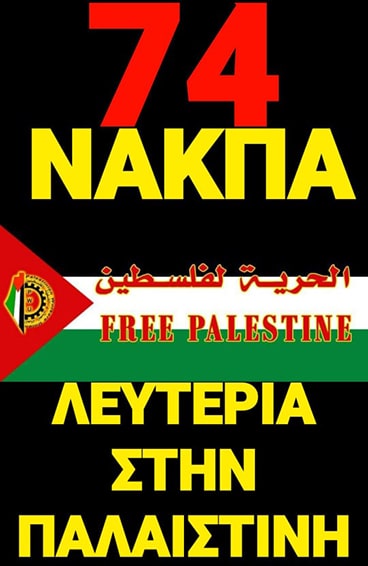 «Την Δευτέρα 16 Μαΐου στις 6 μ.μ η Ένωση Παλαιστίνιων Εργαζομένων καλεί σε παράσταση/ συγκέντρωση διαμαρτυρίας έξω από την ισραηλινή πρεσβεία τον αλληλέγγυο ελληνικό λαό για την αδιάκοπη ΝΑΚΜΠΑ που αποσκοπεί στον αφανισμό του λαού μας από την πατρίδα μας.