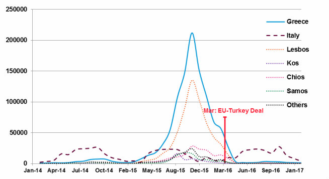αναπτυξιακής βοήθειας, συνδέοντας την «επιτυχία» με τις μειώσεις στη μετανάστευση», αναφέρει στην έκθεση της η Oxfam. Προσθέτει ωστόσο ότι η συμφωνία Ε.Ε. – Τουρκίας δεν επηρέασε ούτε καν τον βασικό στόχο που οδήγησε την Ευρώπη στη σύναψη της, τη μείωση δηλαδή των ανθρώπων που επιχειρούν να περάσουν τα ευρωπαϊκά σύνορα. Όπως δείχνει το παρακάτων γράφημα, ο αριθμός τους ήδη είχε ξεκινήσει να μειώνεται δραματικά από τον Νοέμβριο του 2015, συνεχίζοντας απλώς την ίδια πορεία και μετά τη συμφωνία, χωρίς σημαντική αλλαγή
