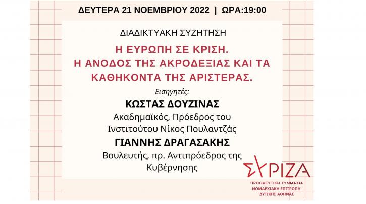 Η Νομαρχιακή επιτροπή Δυτικής Αθήνας του ΣΥΡΙΖΑ - ΠΣ, σε συνεργασία με το ινστιτούτο «Νίκος Πουλαντζάς», προσκαλεί σε διαδικτυακή συζήτηση που διοργανώνει την Δευτέρα 21/11 στις 19.00 με θέμα: «Η Ευρώπη σε κρίση - Η άνοδος της Ακροδεξιάς και τα καθήκοντα της Αριστεράς».