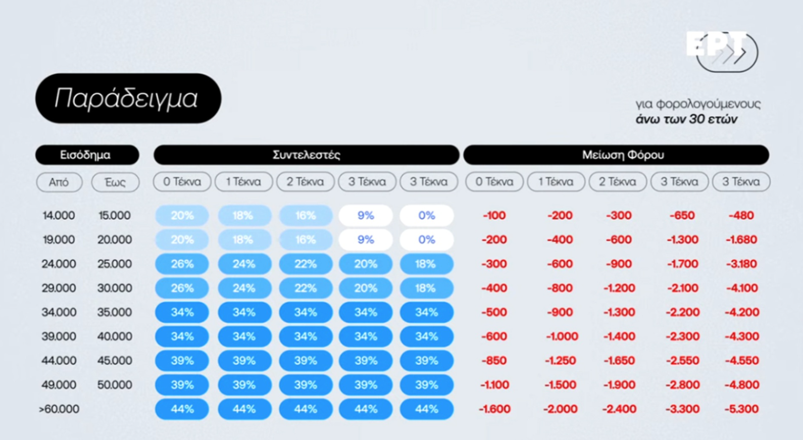 • Οι συντελεστές μηδενίζονται για φορολογούμενους με 4 παιδιά και πάνω.