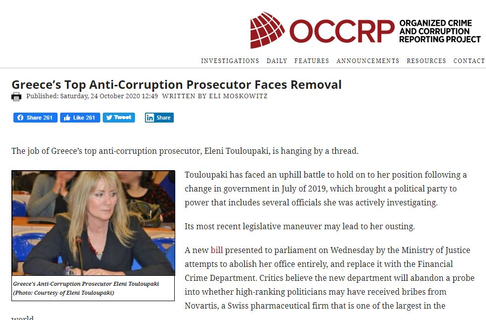 Στην ιστοσελίδα του, που ασχολείται με υποθέσεις Διαφθοράς στον πλανήτη, ο Οργανισμός παρουσιάζει την υπόθεση της Ελένης Τουλουπάκη, με αναφορές στον εξωδικαστικό συμβιβασμός της Novartis στις ΗΠΑ, τις πληροφορίες για Ελλάδα και το δύσκολο έργο που ανέλαβε η εισαγγελέας Διαφθοράς, να διερευνήσει την πιθανή εμπλοκή πολιτικών προσώπων. Η ιστοσελίδα μεταφέρει τις δηλώσεις του Αντώνη Σαμαρά περί «σκευωρίας» και «σκευωρών που θα λογοδοτήσουν» όταν η ΝΔ ήταν ακόμα στην αντπολίτευση. Μεταφέρει επίσης τη δίωξη κατά της Τουλουπάκη για «κατάχρηση εξουσίας», αλλά και την προσφυγή της στο Ευρωπαϊκό Δικαστήριο Δικαιωμάτων του Ανθρώπου.