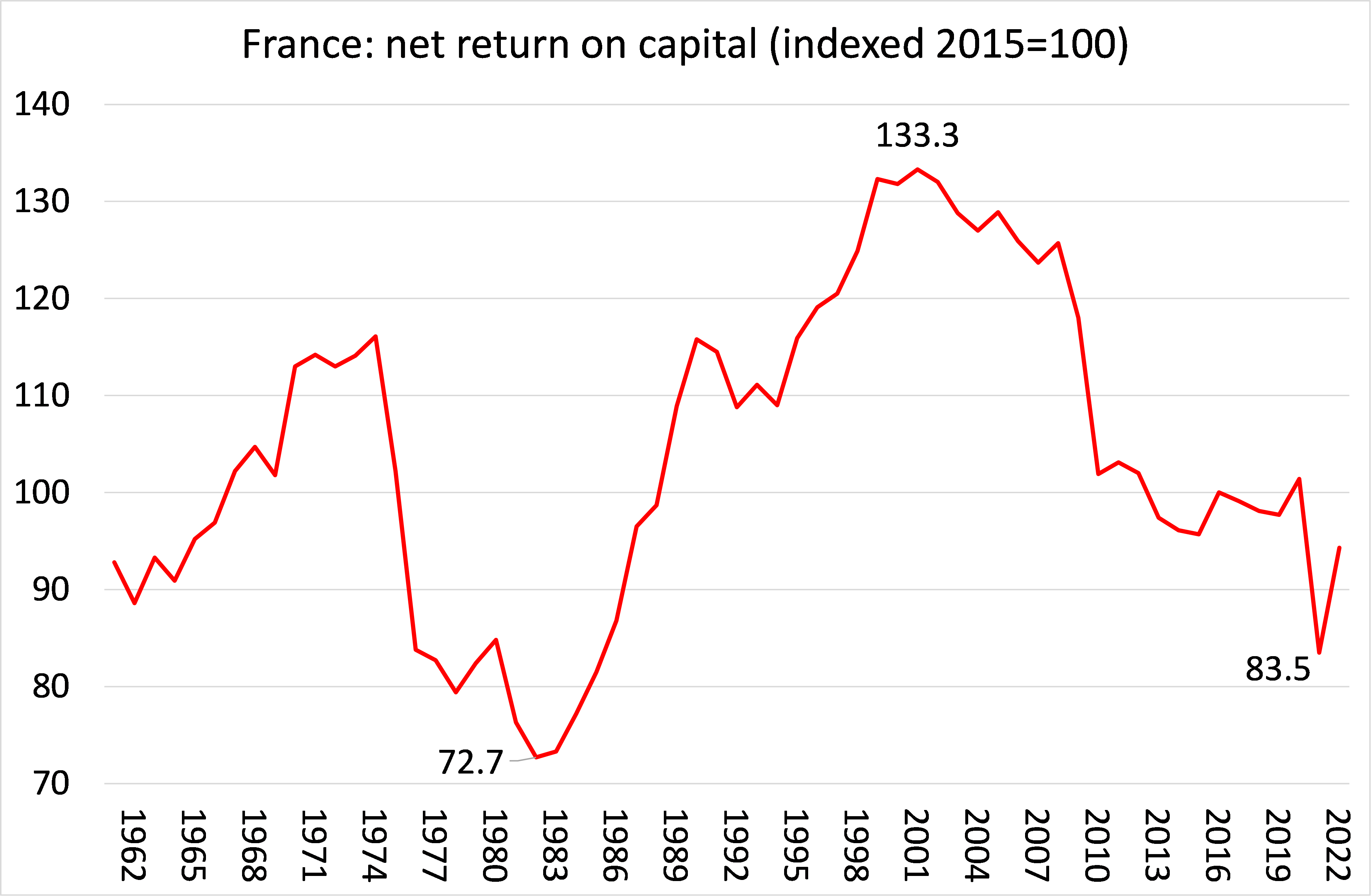 Όπως πάντα, πίσω από αυτή τη σχετική στασιμότητα κρύβεται η μείωση της κερδοφορίας του κεφαλαίου. Η κερδοφορία του γαλλικού κεφαλαίου κορυφώθηκε στις αρχές του 21ου αιώνα και έκτοτε παρουσιάζει πτωτική τάση. Υπήρξε μια απότομη πτώση κατά τη Μεγάλη Ύφεση και καμία ανάκαμψη κατά την τελευταία δεκαετία, με αποκορύφωμα μια άλλη απότομη πτώση στην ύφεση της Covid το 2020.
