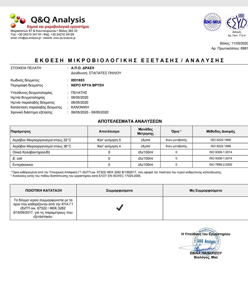 Έκθεση Μικροβιολογικής εξέτασης/ ανάλυσης νερού από την Κρύα Βρύση που δημοσιεύτηκε στην τοπική ομάδα δράσης «ΑΠΟΔράσης»:
