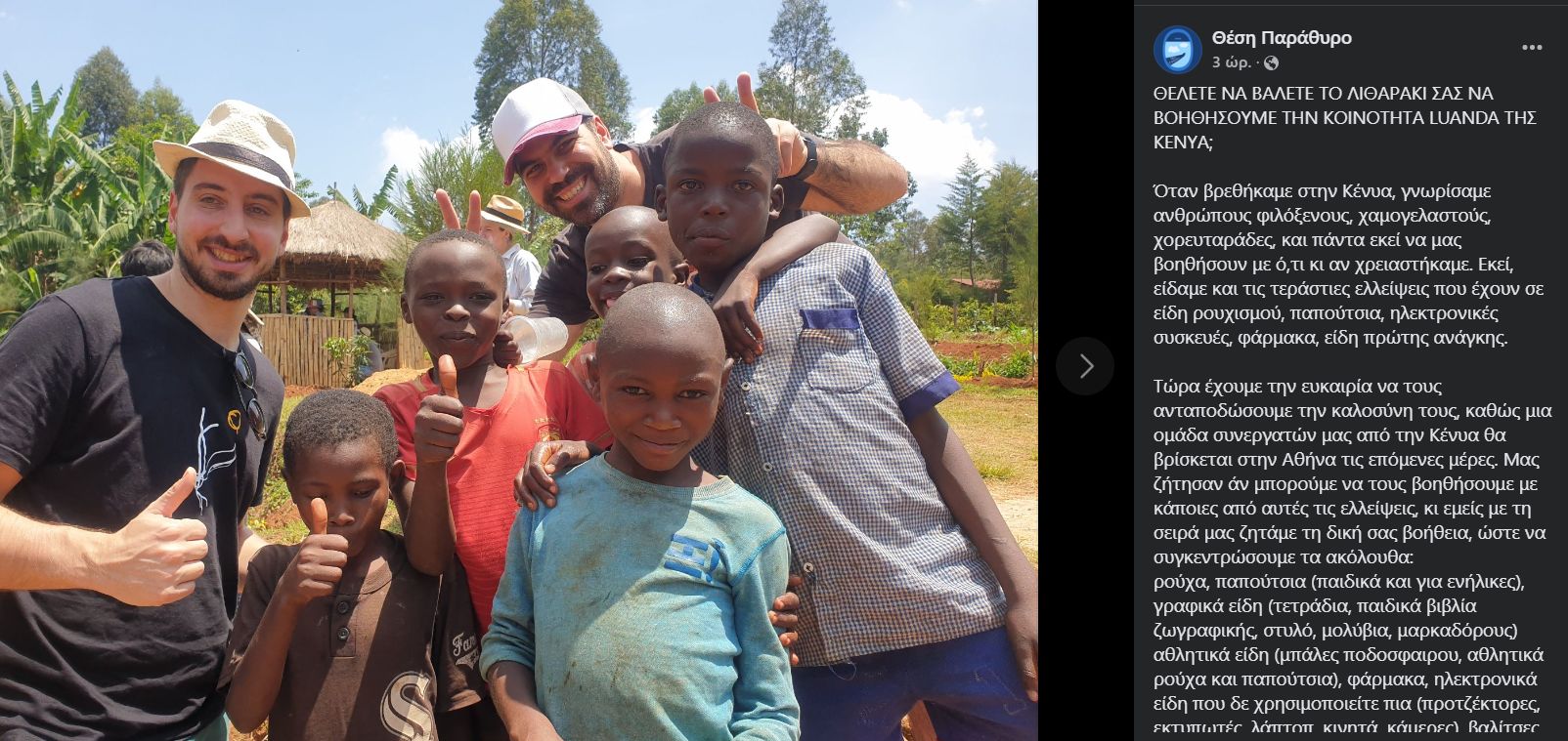 Η ζωή τους σε τίποτα δε θυμίζει τη ζωή σε μια δυτική πόλη. Κι οι ανάγκες τους είναι πολλές. Ο Μιχάλης με την ομάδα του αποφάσισαν να βοηθήσουν την κοινότητα με όποιον τρόπο μπορούν, ακόμη κι αν τώρα βρίσκονται χιλιόμετρα μακριά από εκείνους τους φιλόξενους, χαμογελαστούς, χορευταράδες ανθρώπους. «Τώρα έχουμε την ευκαιρία να τους ανταποδώσουμε την καλοσύνη τους, καθώς μια ομάδα συνεργατών μας από την Κένυα θα βρίσκεται στην Αθήνα τις επόμενες μέρες. Μας ζήτησαν αν μπορούμε να τους βοηθήσουμε με κάποιες από τις ελλείψεις, κι εμείς με τη σειρά μας ζητάμε τη δική σας βοήθεια, ώστε να συγκεντρώσουμε τα ακόλουθα: ρούχα, παπούτσια (παιδικά και για ενήλικες), γραφικά είδη (τετράδια, παιδικά βιβλία ζωγραφικής, στυλό, μολύβια, μαρκαδόρους) αθλητικά είδη (μπάλες ποδοσφαίρου, αθλητικά ρούχα και παπούτσια), φάρμακα, ηλεκτρονικά είδη που δε χρησιμοποιείτε πια (προτζέκτορες, εκτυπωτές, λάπτοπ, κινητά, κάμερες), βαλίτσες, καθώς κι άλλα είδη πρώτης ανάγκης. Φυσικά τα παραπάνω θα πρέπει να είναι σε αξιοπρεπή κατάσταση, δηλαδή καθαρά ρούχα χωρίς τρύπες, λειτουργικές συσκευές, κλπ. Αν θέλετε να βοηθήσετε την κοινότητα Luanda, μπορείτε να μας στείλετε μήνυμα, ή να έρθετε στο γραφείο μας στο Μαρούσι (Πατρόκλου 1 και Παραδείσου 14, 5ος όροφος) ΤΡΙΤΗ 14 ΙΟΥΝΗ 11:00 – 15:00 που θα συγκεντρώνουμε όλα τα καλούδια σας!».