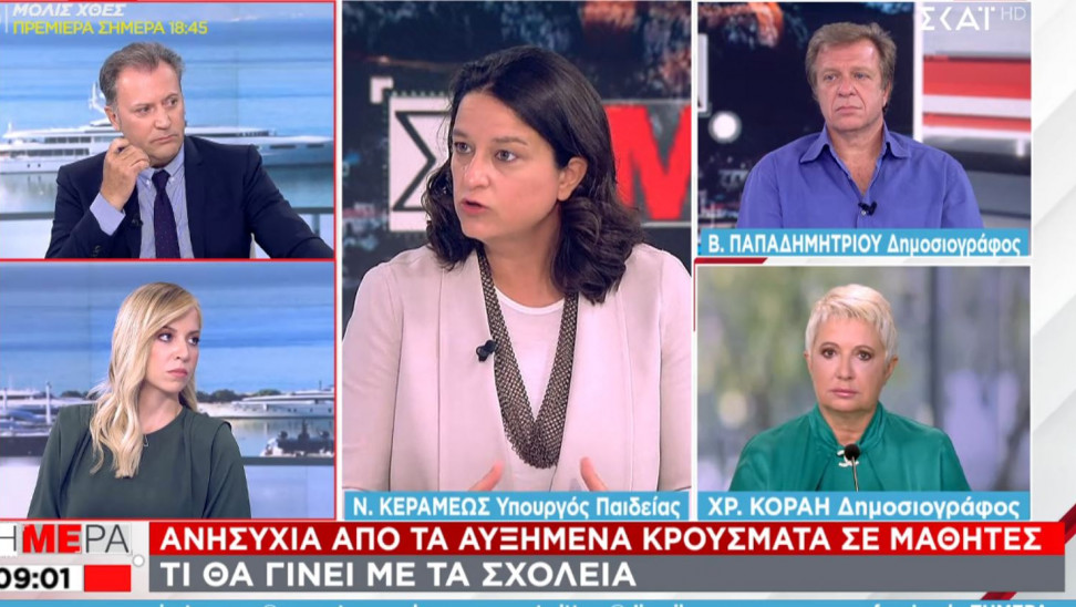 «Αυτή την στιγμή, με δύο πλήρεις εβδομάδες λειτουργίας των σχολείων μας, έχουμε λιγότερα κρούσματα από τον Αύγουστο όταν τα σχολεία ήταν κλειστά», προσέθεσε η Κεραμέως στην πρωϊνή εκπομπή του ΣΚΑΙ με τους Δημήτρη Οικονόμου και η Μαρία Αναστασοπούλου. Απέδωσε την παραπάνω εικόνα στα πρωτόκολλα υγείας, καθώς τα σχολεία φέτος έχουν ανοίξει με τεστ και τον εμβολιασμό των εκπαιδευτικών.