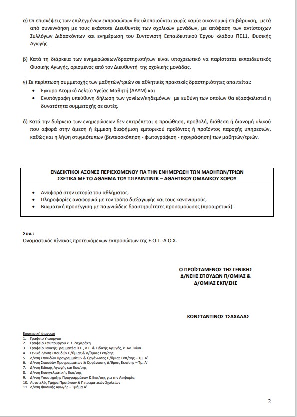 β) Κατά τη διάρκεια των ενημερώσεων/δραστηριοτήτων είναι υποχρεωτικό να παρίσταται εκπαιδευτικός Φυσικής Αγωγής, ορισμένος από τον Διευθυντή της σχολικής μονάδας.