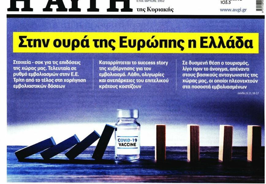 Η εφημερίδα τονίζει επίσης ότι «καταρρίπτεται το success story της κυβέρνησης για τον εμβολιασμό» και ότι ο τουρισμός βρίσκεται σε δυσμένη θέση λίγο πριν το άνοιγμα «απέναντι στους βασικούς ανταγωνιστές της χώρας μας, οι οποίοι πλεονεκτούν στα ποσοστά εμβολιασμένων».