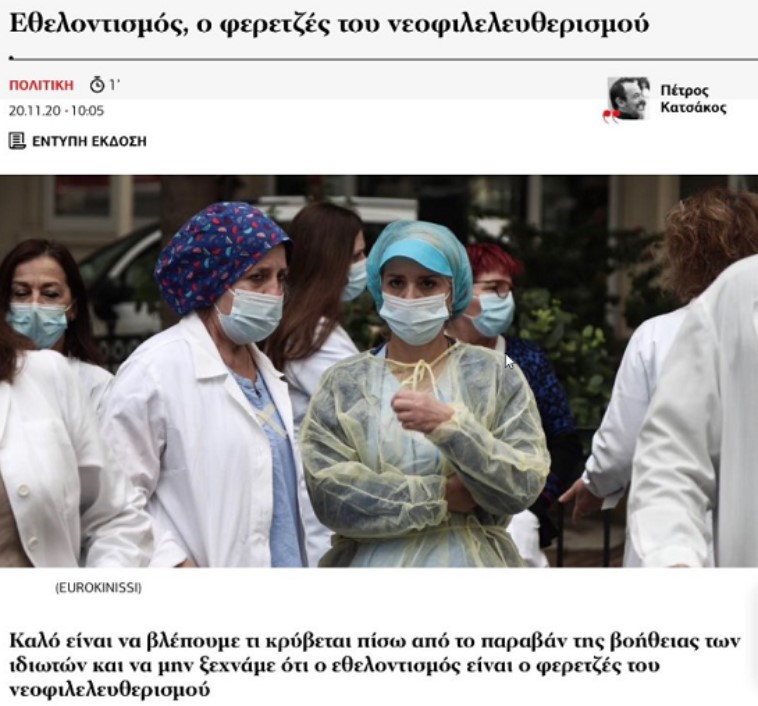 Άρθρο γνώμης του δημοσιογράφου της Αυγής έβαλε το Σάββατο στο στόχαστρό της η Νέα Δημοκρατία, καθώς ο Πέτρος Κατσάκος τόλμησε να κριτικάρει το γεγονός πως η κυβέρνηση έχει αφήσει χωρίς χρηματοδότηση το Εθνικό Σύστημα Υγείας, και την ίδια ώρα υπερπροβάλλει την -πράγματι συγκινητική- απόφαση των νοσηλευτριών από την Κρήτη και αλλού, να σπεύσουν στη Θεσσαλονίκη για να βοηθήσουν να καλυφθούν τα προβλήματα υποστελέχωσης.