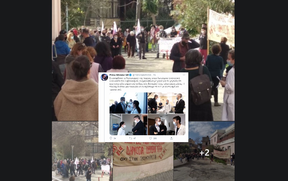 Ωστόσο, ο Σύλλογος Εργαζομένων του Νοσοκομείου Ικαρίας είχε προαναγγείλει συγκέντρωση έξω από την είσοδο του νοσοκομείου, με την αστυνομία να αναπτύσσει πρωτοφανείς δυνάμεις για τα δεδομένα του νησιού απέναντί τους, να μην τους επιτρέπει να προσεγγίσουν τον πρωθυπουργό, και τον Κ. Μητσοτάκη να φτάνει στο σημείο να μπει στο νοσοκομείο από την πίσω πόρτα.