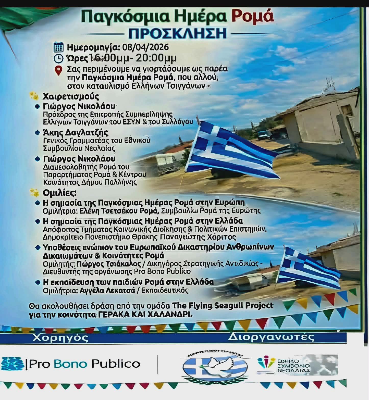 Σας προσκαλούμε την Τετάρτη 8 Απριλίου, από τις 14:00 έως τις 21:00, στον καταυλισμό Ρομά Γέρακα, σε μια ξεχωριστή ημέρα αφιερωμένη στην ιστορία, την ταυτότητα και τον πολιτισμό των Ρομά.