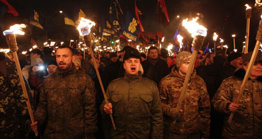 Οι νεοναζί που συγκεντρώθηκαν στους δρόμους του Κιέβου, φώναζαν συνθήματα όπως: «Δόξα στο έθνος και θάνατος στους εχθρούς», «Η Ουκρανία ανήκει στους Ουκρανούς» και «Ο Μπαντέρα θα επιστρέψει και θα αποκαταστήσει την τάξη».