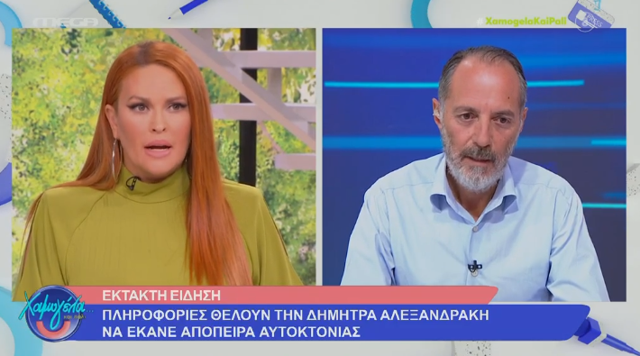 «Πληροφορίες θέλουν τη Δήμητρα Αλεξανδράκη να έκανε απόπειρα αυτοκτονίας». Η είδηση αρχικά μεταδόθηκε …με επιφύλαξη από την εκπομπή «Χαμογέλα και πάλι» της Σίσσυς Χρηστίδου. Ο δημοσιογράφος, μάλιστα, ανέφερε ότι το μοντέλο, μιλώντας τηλεφωνικά με φίλη της, δήλωσε ότι «δεν θέλω άλλο τη ζωή μου». «Πήγαν άμεσα στο ξενοδοχείου όπου διέμενε στη Θεσσαλονίκη, την εντόπισαν σε μια λίμνη αίματος» είπε ο δημοσιογράφος. Η κοπέλα παρενέβη οργισμένη μέσω τηλεφωνικής επικοινωνίας. «Αλλάξτε άμεσα στον τίτλο, έχω μια οικογένεια από πίσω μου. Έτσι και ζούσε η γιαγιά μου και το έβλεπε αυτό θα έμενε στον τόπο». Η Σίσσυ Χρηστίδου και το επιτελείο της εκπομπής προσπαθούσε, ατυχώς, να το… «σώσει».