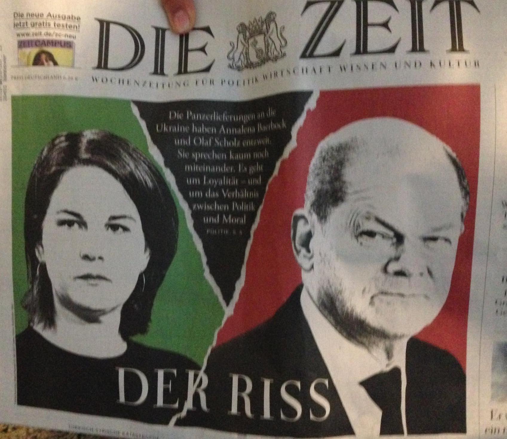 Στο θέμα των Λέοπαρντ και των παραδόσεων τεθωρακισμένων στην Ουκρανία αποδίδει σοβαρά προβλήματα στη γερμανική κυβέρνηση, που κάνει και πρωτοσέλιδό της, η Die Zeit. Με ένα φωτογραφικό ρήγμα μεταξύ των φωτογραφιών του καγκελάριου Ολαφ Σολτς και της υπουργού Εξωτερικών, Αναλένα Μπέρμποκ, και κεντρικό τίτλο «Η Ρήξη» το φύλλο αναφέρει συγκεκριμένα ότι «οι παραδόσεις των τεθωρακισμένων στην Ουκρανία έχουν διχάσει την Μπέρμποκ και τον Σόλτς. Σχεδόν δεν μιλιούνται. Πρόκειται για ζήτημα εμπιστοσύνης και της σχέσης μεταξύ πολιτικής και ηθικής».