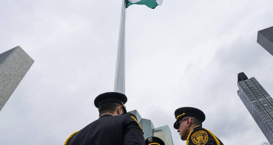 Η κόκκινη, μαύρη, λευκή και πράσινη παλαιστινιακή σημαία υψώθηκε περίπου στις 13:15 τοπική ώρα στην έδρα του ΟΗΕ στη Νέα Υόρκη.