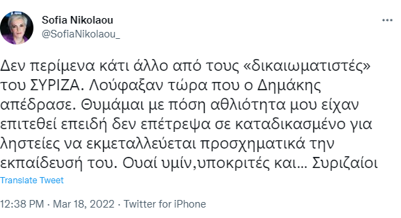 «Δεν περίμενα κάτι άλλο από τους «δικαιωματιστές» του ΣΥΡΙΖΑ. Λούφαξαν τώρα που ο Δημάκης απέδρασε. Θυμάμαι με πόση αθλιότητα μου είχαν επιτεθεί επειδή δεν επέτρεψα σε καταδικασμένο για ληστείες να εκμεταλλεύεται προσχηματικά την εκπαίδευσή του. Ουαί υμίν,υποκριτές και… Συριζαίοι». Έτσι σχολίασε η Γενική Γραμματέας Αντεγκληματικής Πολιτικής, Σοφία Νικολάου, το γεγονός ότι το βραχιολάκι του Βασίλη Δημάδη σταμάτησε ξαφνικά να δίνει σήμα. Στις 17 Μαρτίου δεν εμφανίστηκε στο Πανεπιστήμιο όπου έπρεπε να πάει. Υπενθυμίζεται ότι ο κρατούμενους των φυλακών Κορυδαλλού και φοιτητής στο Πολιτικό Τμήμα της Νομικής είχε ηλεκτρονικό βραχιολάκι προκειμένου να λαμβάνει την εκπαιδευτική άδεια που δικαιούται.