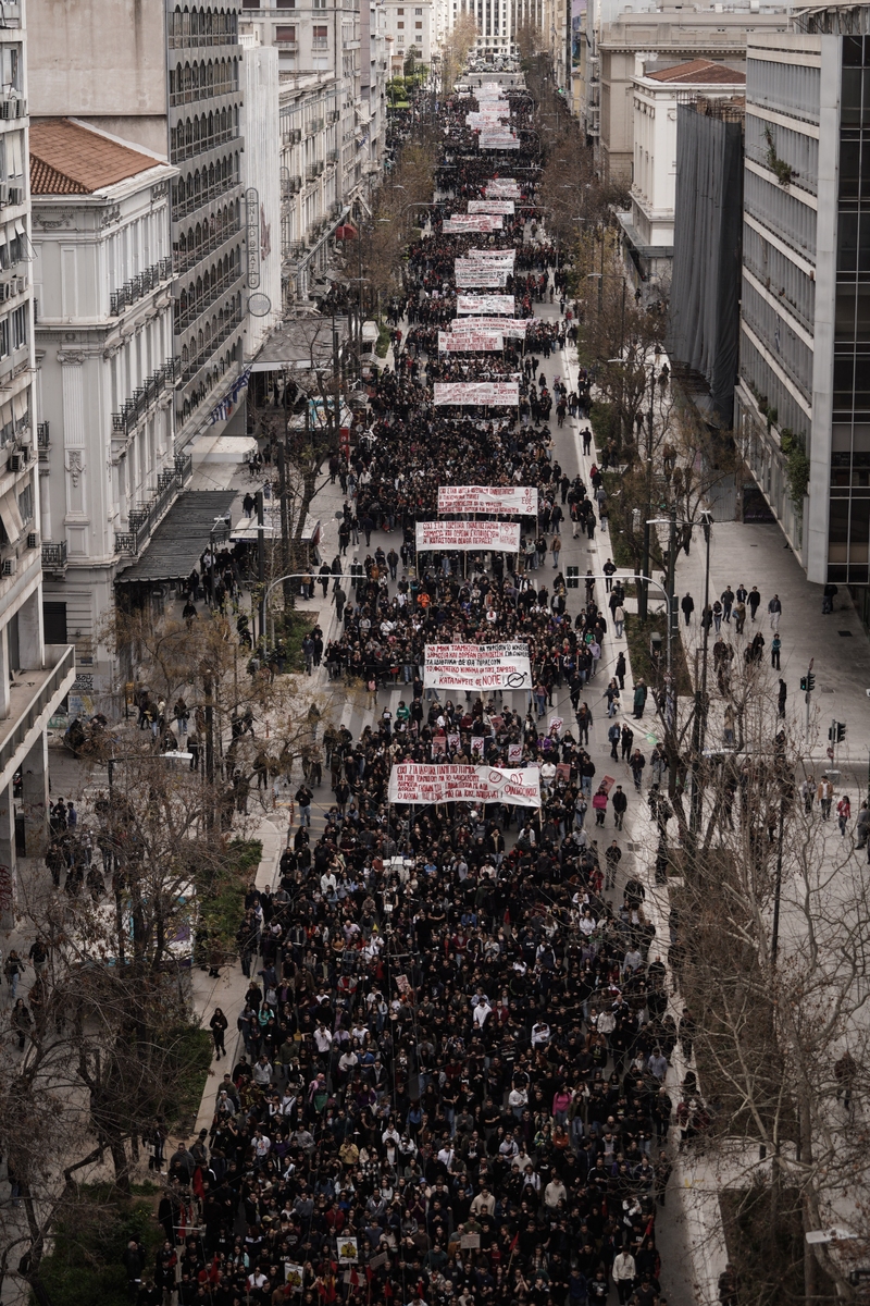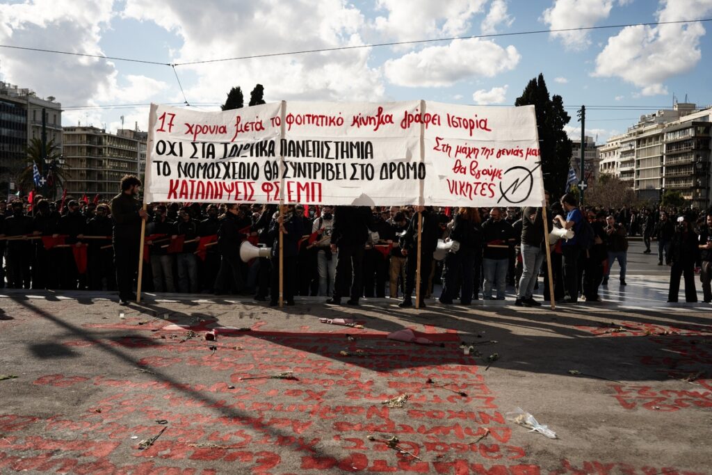 Οι φοιτητές ανάρτησαν, επίσης, στην πρόσοψη πολυκαταστήματος στο Σύνταγμα, ένα μεγάλο πανό, που γράφει «Ή τα κέρδη τους ή οι σπουδές μας», ενώ διαδηλωτές άφησαν λουλούδια στο σημείο όπου έχουν γραφτεί τα ονόματα των νεκρών των Τεμπών.