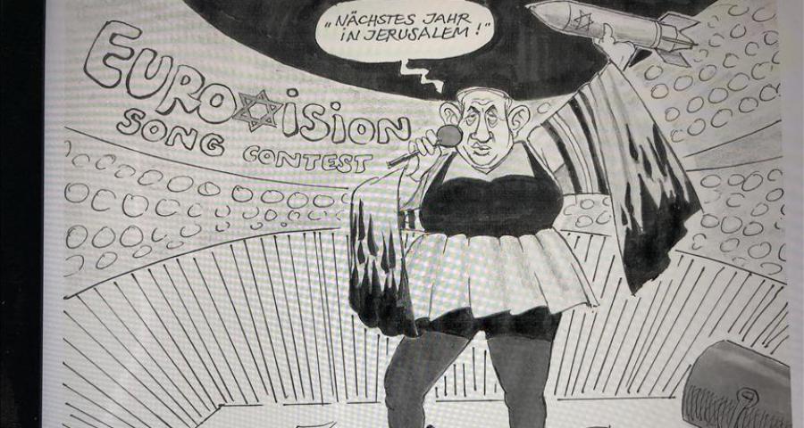 Στο επίμαχο σκίτσο, ο σκιτσογράφος απεικονίζει τον Νετανιάχου με έναν πύραυλο στο χέρι του, ντυμένο στα ρούχα της Μπαρζιλάι και λέγοντας «του χρόνου στην Ιερουσαλήμ», όπως πράγματι δήλωσε την ώρα της βράβευσής της η διαγωνιζόμενη από το Ισραήλ.