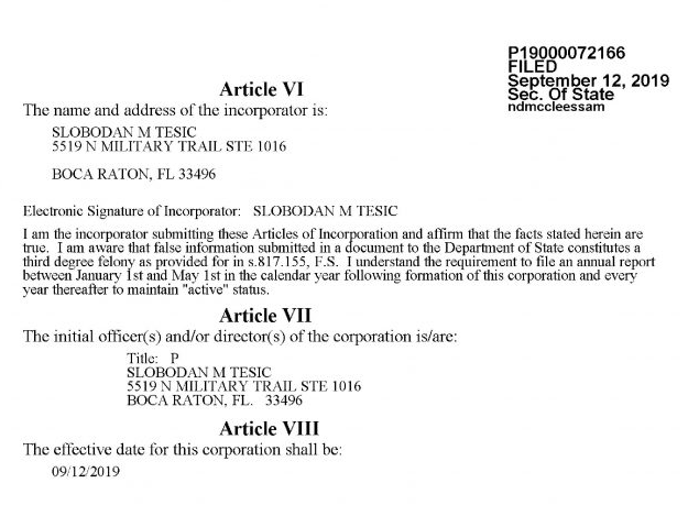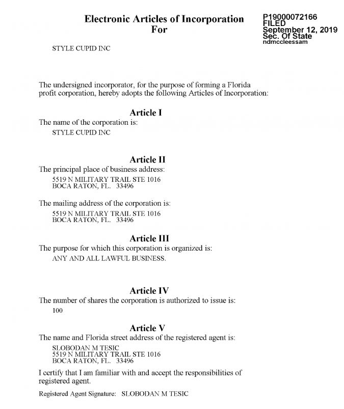 Η Style Cupid Inc. κατέστη ανενεργή στις 31 Μαρτίου, ενώ σύμφωνα με το έγγραφο η εταιρεία ήταν εγγεγραμμένη στη διεύθυνση 5519 N MILITARY TRAIL STE 1016, 33496, στο Μπόκα Ράτον της Φλόριδα. Σύμφωνα με το ιστότοπο καταχώρησης ακινήτων Trulia Real Estate, η διεύθυνση της Style Cupid Inc. στη Φλόριντα, φανερώνει το παρακάτω ακίνητο: