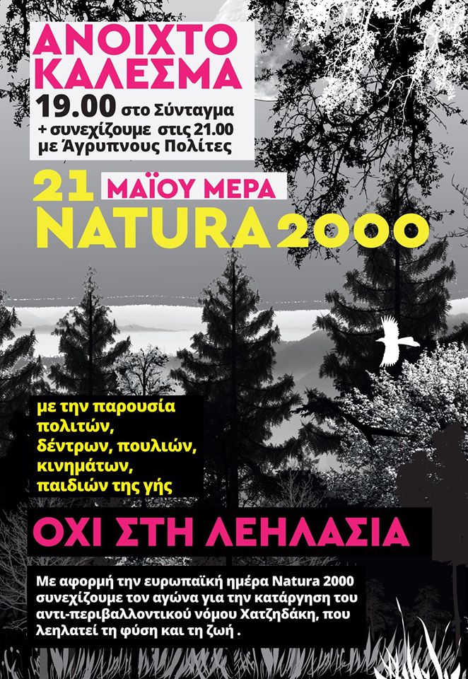 «Καλούμε κάθε σκεπτόμενο άνθρωπο που θέλει να συνεχίσουν να υπάρχουν δημόσια αγαθά, φυσικοί πόροι καθαροί και διαθέσιμοι σήμερα και για τις επόμενες γενεές, να ενώσει τη φωνή του μαζί μας στην εκδήλωση την Πέμπτη 21 Μαϊου και ώρα 19.00, μπροστά από τη Βουλή, όχι όμως για να γιορτάσουμε την πανευρωπαϊκή ημέρα Νατούρα αλλά για να απαιτήσουμε να αποσυρθεί τώρα το περιβαλλοντικο έκτρωμα που πλέον αποκαλείται νόμος» αναφέρεται, μεταξύ άλλων στο κάλεσμα.