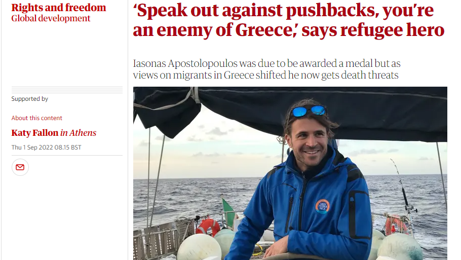 «Εάν το να αγαπώ τη χώρα μου σημαίνει να δέχομαι τις δολοφονίες προσφύγων στα σύνορά μας, τότε είμαι περήφανος που είμαι προδότης» δηλώνει ο Ιάσονας Απόστολόπουλος και εξηγεί την κατάσταση στην Ελλάδα λέγοντας «εάν μιλάς κατά των επαναπροωθήσεων, τότε είσαι “εχθρός της Ελλάδας”. Αυτό είναι το αφήγημα».