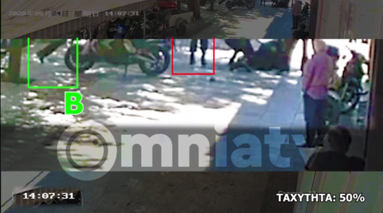 Στην αρχή του βίντεο απεικονίζεται ο πρώτος νεαρός (Α – σε πράσινο πλαίσιο), με τον οποίο, σύμφωνα με τη μήνυση που έχει υποβληθεί εναντίον των ΔΙΑΣ, διαπληκτίστηκε ένας εκ των αστυνομικών επειδή τους κοιτούσε καθώς πήγαινε σε κοντινό κατάστημα να πάρει καφέ. Οι αστυνομικοί (σε κόκκινο πλαίσιο) βρίσκονται δίπλα στις μηχανές τους (σε κόκκινο πλαίσιο) μαζί με τον Α και φαίνεται ότι τον περικυκλώνουν.