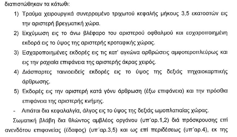 - Τραύμα χειρουργικά συνεραμμένο τριχωτού κεφαλής μήκους 3,5 εκατοστών εις αριστερή βρεγματική χώρα.