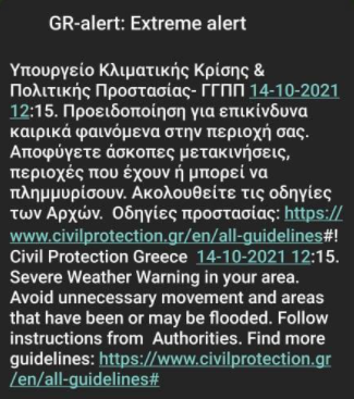 «Προειδοποίηση για επικίνδυνα καιρικά φαινόμενα στην περιοχή σας. Αποφύγετε άσκοπες μετακινήσεις, περιοχές που έχουν ή μπορεί να πλημμυρίσουν. Ακολουθείτε οδηγίες», ανέφερε το μήνυμα του 112.