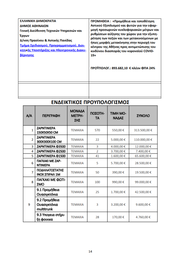 Το κείμενο της εισήγησης της Γενικής Διεύθυνσης Τεχνικών Υπηρεσιών και Έργων του Δήμου Αθήνας με τίτλο «προμήθεια και τοποθέτηση Αστικού Εξοπλισμού και φυτών για την εφαρμογή προσωρινών κυκλοφοριακών μέτρων και ρυθμίσεων αύξησης του χώρου για την εξυπηρέτηση των πεζών και των μετακινούμενων με ήπιες μορφές μετακίνησης στην περιοχή του κέντρου της Αθήνας προς αντιμετώπιση του κινδύνου διασποράς του κορονοιού Covid-19», προβλέπει ιδιαίτερα υψηλές τιμές για τη «διακόσμηση» των δρόμων του κέντρου της Αθήνας.