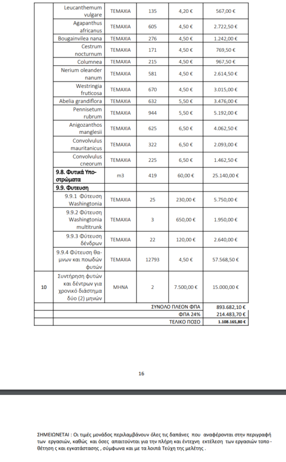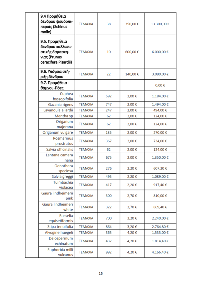 -Για 570 ορθογωνικές ζαρντινιέρες από λαμαρίνα, με διαστάσεις 1,5 επί 0,5 μέτρο και ύψος 50 εκατοστά, το ενδεικτικό κόστος για κάθε μια ήταν 550 ευρώ και η προσφορά του μειοδότη 506,55/