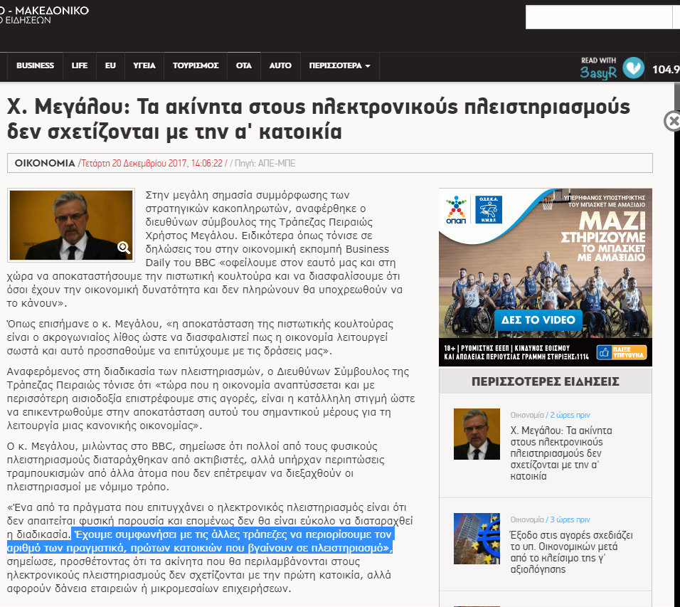Στις 12 Δεκεμβρίου ο διευθύνων σύμβουλος της Τράπεζας Πειραιώς, Χρήστος Μεγάλου, μίλησε στην εκπομπή Business Daily του BBC για το θέμα των πλειστηριασμών. Οι δηλώσεις του κ.Μεγάλου δημοσιεύτηκαν σήμερα από το Αθηναϊκό Πρακτορείο και αναπαράχθηκαν από πολλά ΜΜΕ. Ο τίτλος που επέλεξε το ΑΠΕ είναι: «Χ. Μεγάλου: Τα ακίνητα στους ηλεκτρονικούς πλειστηριασμούς δεν σχετίζονται με την α' κατοικία». Το πρόβλημα είναι ότι ο επικεφαλής της Τράπεζας Πειραιώς δεν λέει ακριβώς αυτό.