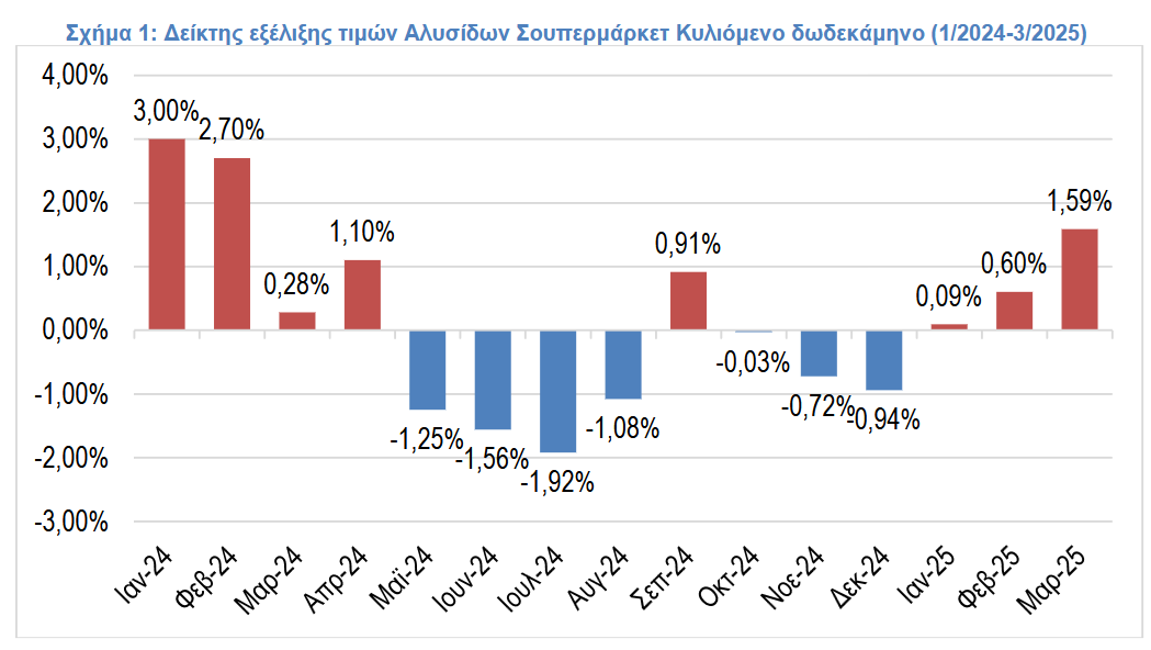 - Ο πληθωρισμός στις αλυσίδες σουπερμάρκετ είναι της τάξης του +1,59% τον Μάρτιο 2025 σε σχέση με τον Μάρτιο 2024. Συνολικά το κυλιόμενο 12μηνο (Απρίλιος 2024-Μάρτιος 2025) καταγράφει μείωση -0,27%, ενώ το Α’ τρίμηνο 2025 καταγράφει αύξηση +0,76%. Σημειώνεται ότι οι τιμές του Μαρτίου 2025 σε σχέση με τον προηγούμενο μήνα Φεβρουάριο 2025 καταγράφονται μειωμένες κατά -0,19%. Η αυξητική τάση που καταγράφεται τον Μάρτιο 2025 σε σχέση με τον Μάρτιο του προηγούμενου έτους, παρά τη μείωση του σχετικού δείκτη οφείλεται στη χαμηλή βάση σύγκρισης του προηγούμενου έτους.