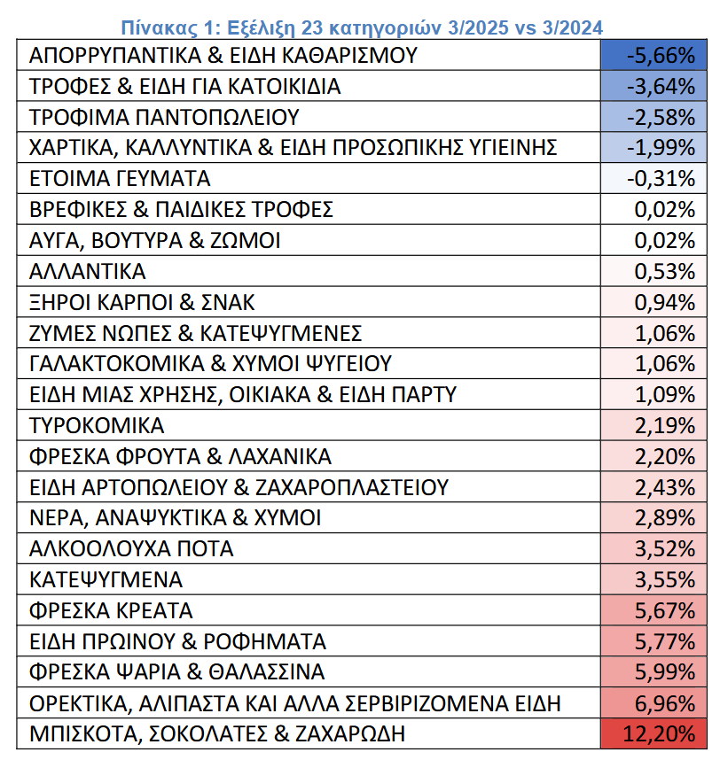 Στο πλαίσιο στοχευμένης έρευνας του Ινστιτούτου Έρευνας Λιανεμπορίου Καταναλωτικών Αγαθών (ΙΕΛΚΑ) αποκλειστικά στο κανάλι των μεγάλων αλυσίδων σουπερμάρκετ σχετικά με τις πληθωριστικές τάσεις στο οργανωμένο λιανεμπόριο τροφίμων, εξετάστηκε η πορεία των τιμών ανάμεσα στον Μάρτιο 2025.