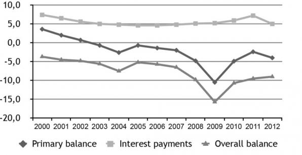 The main source of debt in Greece pre-crisis were interest payments on debt already incurred rather than primary deficits: