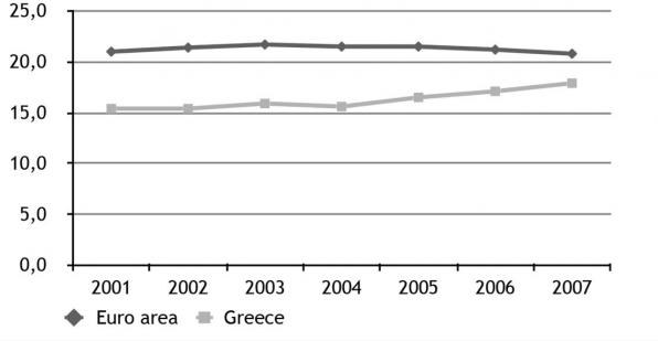 General Government expenditure as a percentage of GDP. Source: The Political Economy of the Greek Crisis
