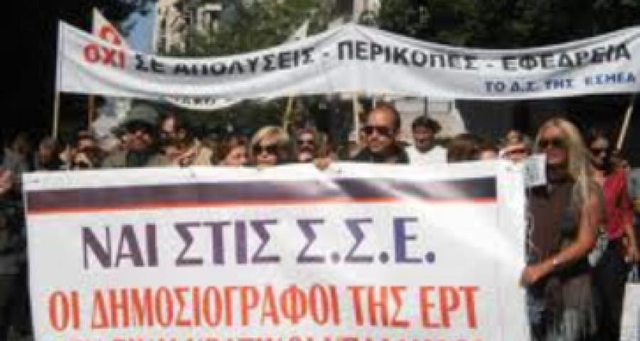 Καταγγέλλουμε τους κυβερνητικούς χειρισμούς και τη διαδικασία, που οδήγησε σ’ αυτήν την ΚΥΑ, η οποία καταργεί κάθε έννοια ΣΣΕ, τη δημοσιογραφική λειτουργία και μειώνει δραματικά τους μισθούς, με ό,τι αυτό συνεπάγεται για τους εργαζόμενους, τα ασφαλιστικά τους ταμεία και τη λειτουργία της ενημέρωσης. Απαιτούμε τη διατήρηση των ΣΣΕ στα δημόσια ΜΜΕ (ΕΡΤ, ΑΠΕ, ΓΓΕ-ΓΓΕ, δημοτικοί ραδιοσταθμοί και γραφεία τύπου). Απαιτούμε την παραμονή στην εργασία τους των «συμβασιούχων» συναδέλφων στην ΕΡΤ, τον «Αθήνα 9,84» και οπουδήποτε αλλού στο δημόσιο τομέα. Καλούμε όλους τους συναδέλφους σε συγκέντρωση, αύριο Τετάρτη, 6 Φεβρουαρίου 2013 στις 12 το μεσημέρι στα γραφεία της ΕΣΗΕΑ (Ακαδημίας 20) προκειμένου να συζητηθεί η κλιμάκωση και το περιεχόμενο του αγώνα.